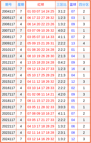 三区号码【23-33】:在积年双色球第117期同时奖号中,该区开出率为33.33%,知道一般,与表面概率邻近。本期瞻望该区出号3枚,保举出号可贵:28、29、31。