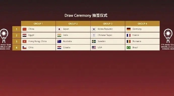 【Group 1】中国、埃及、中国香港、智利【Group 2】日本、印度、澳大利亚、克罗地亚【Group 3】韩国、中国台北、瑞典、好意思国【Group 4】德国、法国、罗马尼亚、巴西","del":0,"gnid":"9c8b3d05d45987d90","img_data":[{"flag":2,"img":[{"desc":"","height":"380","title":"","url":"http://p0.img.360kuai.com/t11fd4c3301efce4bd3f22abc5e.jpg","width":"690"}]}],"original":"1","pat":"art_src_0,fts0,sts0","powerby":"cache","pub_time":1764463352000,"pure":"","rawurl":"http://zm.news.so.com/f4a2161ef41d93b34ea670489f62eafa","redirect":0,"rptid":"1220b81bccb8f919","rss_ext":[],"s":"t","src":"二言三拍","tag":[{"clk":"ksport_1:王曼昱","k":"王曼昱","u":""},{"clk":"ksport_1:中国队","k":"中国队","u":""},{"clk":"ksport_1:王楚钦","k":"王楚钦","u":""},{"clk":"ksport_1:孙颖莎","k":"孙颖莎","u":""},{"clk":"ksport_1:寰球杯","k":"寰球杯","u":""}],"title":"卫冕之路从小组解围运行!成都混团寰球杯当天启幕 中国队首战中国香港队!","type":"zmt","wapurl":"http://zm.news.so.com/f4a2161ef41d93b34ea670489f62eafa","ytag":"体育:乒球","zmt":{"brand":{},"cert":"体育领域创作家","desc":"足球火线不雅察 体坛风浪争霸","fans_num":2744,"id":"3033031686","is_brand":"0","name":"二言三拍","new_verify":"7","pic":"https://p6.img.360kuai.com/t013e3184a1d8a65181.png","real":1,"textimg":"https://p9.img.360kuai.com/bl/0_3/t017c4d51e87f46986f.png","verify":"0"},"zmt_status":0}","errmsg":"","errno":0}